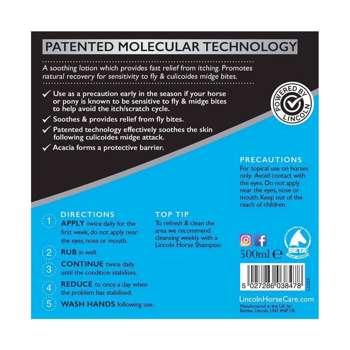 A soothing itch relieving lotion particularly useful before onset, during and for maintaining recovery following a sweet itch attack. Patented molecular technology.